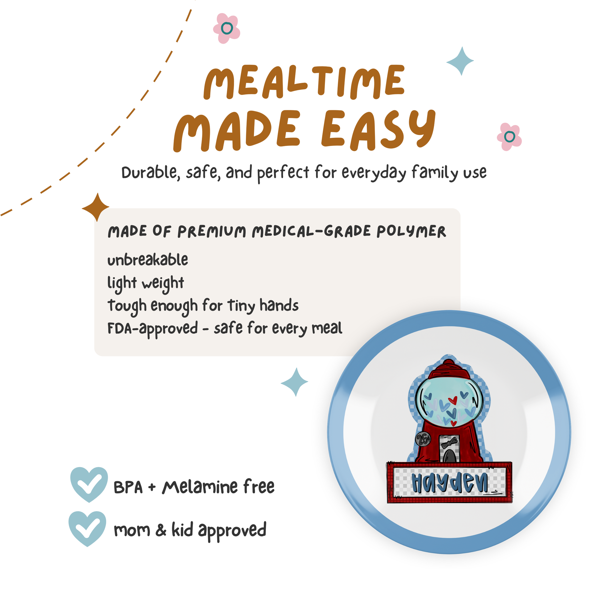 Sweeten up snack time with this personalized Valentine gumball plate—perfect for little hands and big imaginations! Made from durable, unbreakable plastic, it features your child’s name and a heart-filled gumball machine that’s cuter than candy. Ideal for Valentine’s Day or everyday giggles at the table.